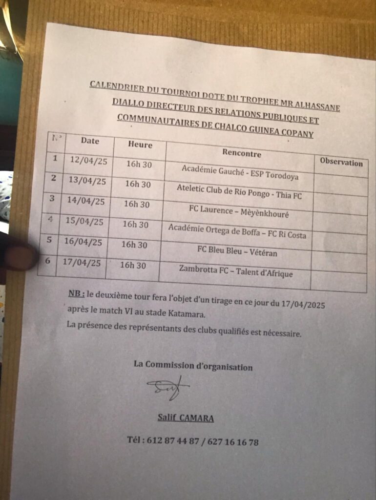Prévu ce 12 Avril au stade préfectoral”katamara”,ce tournoi regroupera 12 équipes de la ville de Boffa et ses confins.L’organisateur(Amara Gaucher) a conféré le nom de son tournoi au Directeur des relations publiques et communautaire,Mr Diallo Alhassane, un choix loin d’être fortuit.Cependant,c’est le club de l’organisateur Académie Gaucher qui donnera le ton face à son homologue de Torodoya.